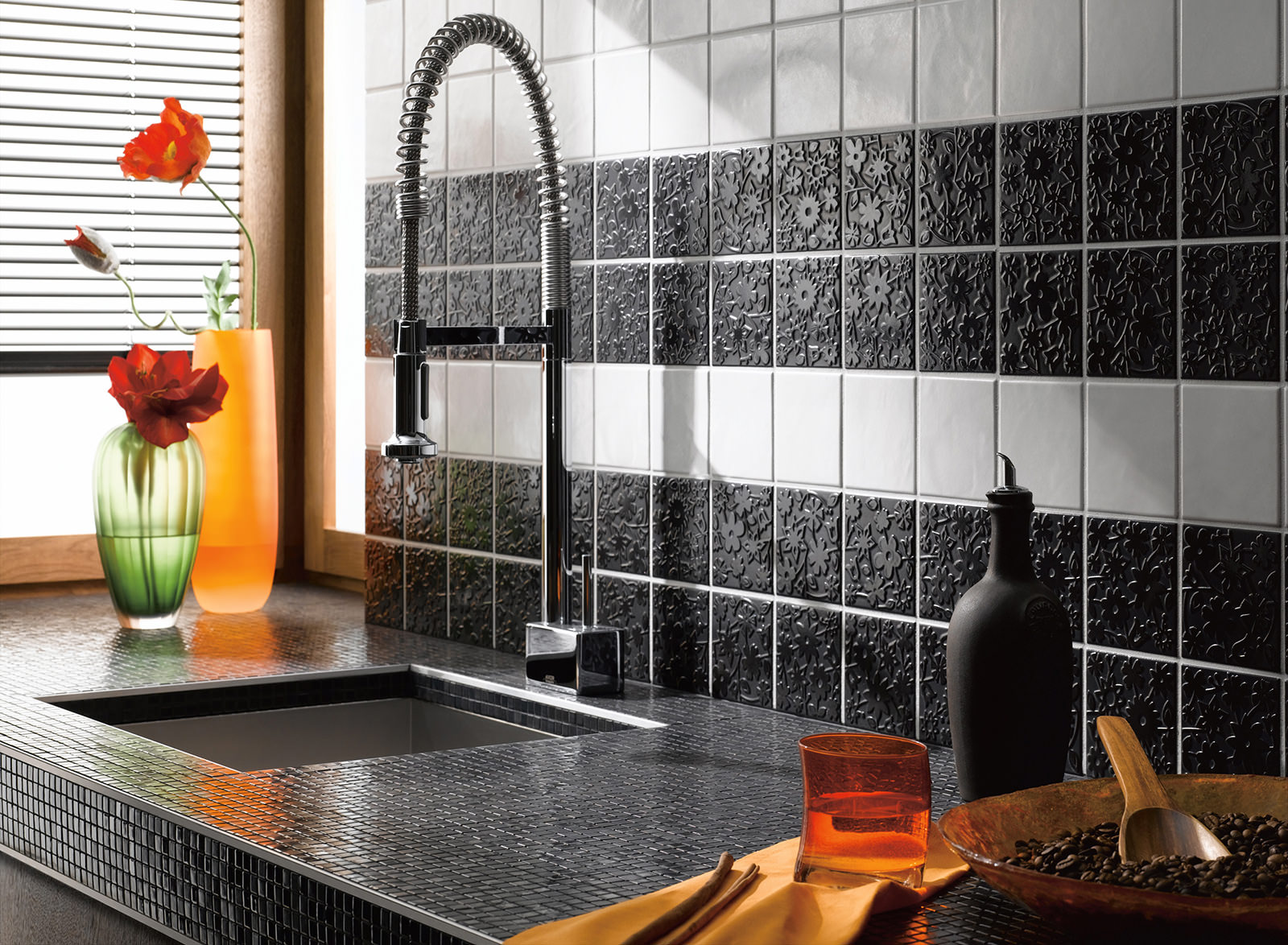 กระเบื้องเดียวกันมีขนาดเล็กกว่าเท่านั้น มันดูสวยงามและสง่างามดูเหมือนว่าทำด้วยมือพอดีกับการตกแต่งภายใน ทนต่ออุณหภูมิสูงน้ำการปนเปื้อนของไขมัน ข้อเสีย: ความเปราะบางของแผ่น.