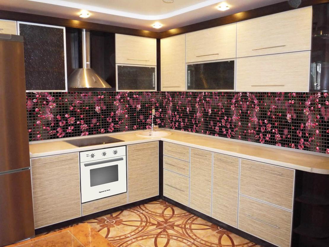 ตัวเลือกที่น่าสนใจและผิดปกติ - รูปภาพของชิ้นกระจก. มันจะเพิ่มความสว่างของพื้นที่ทำงานขยายพื้นที่มองเห็นทำให้ภายในสว่างขึ้นและแสดงออกมากขึ้น คุณสามารถจัดเรียงชิ้นส่วนกระจกด้วยไม้หรือพื้นผิวเซรามิกสร้างเอฟเฟกต์ที่ไม่อาจต้านทานได้ของเกมของพื้นผิวและแสงการรวมกันนี้ดูผิดปกติ