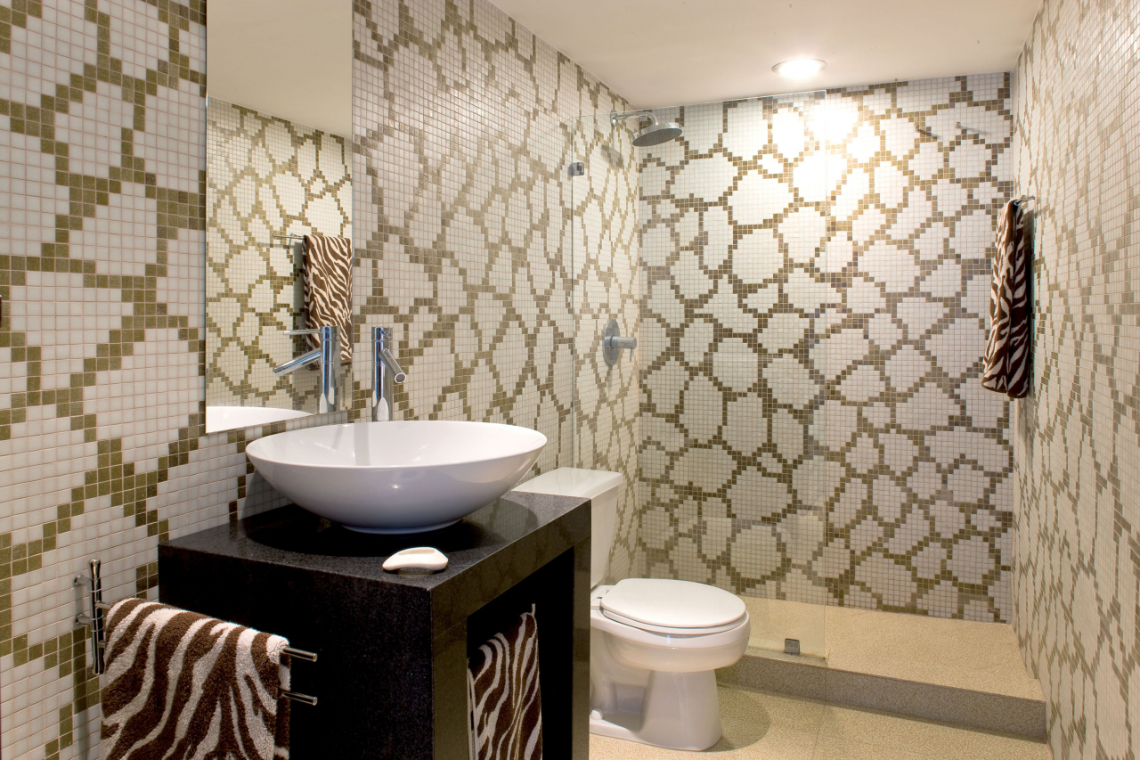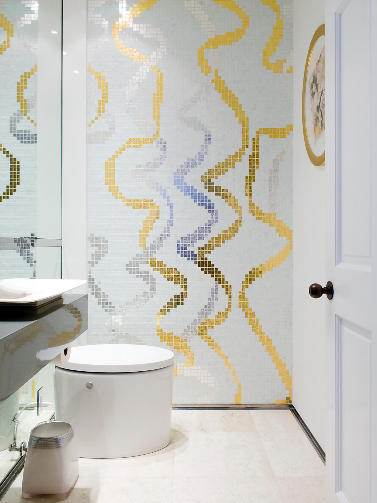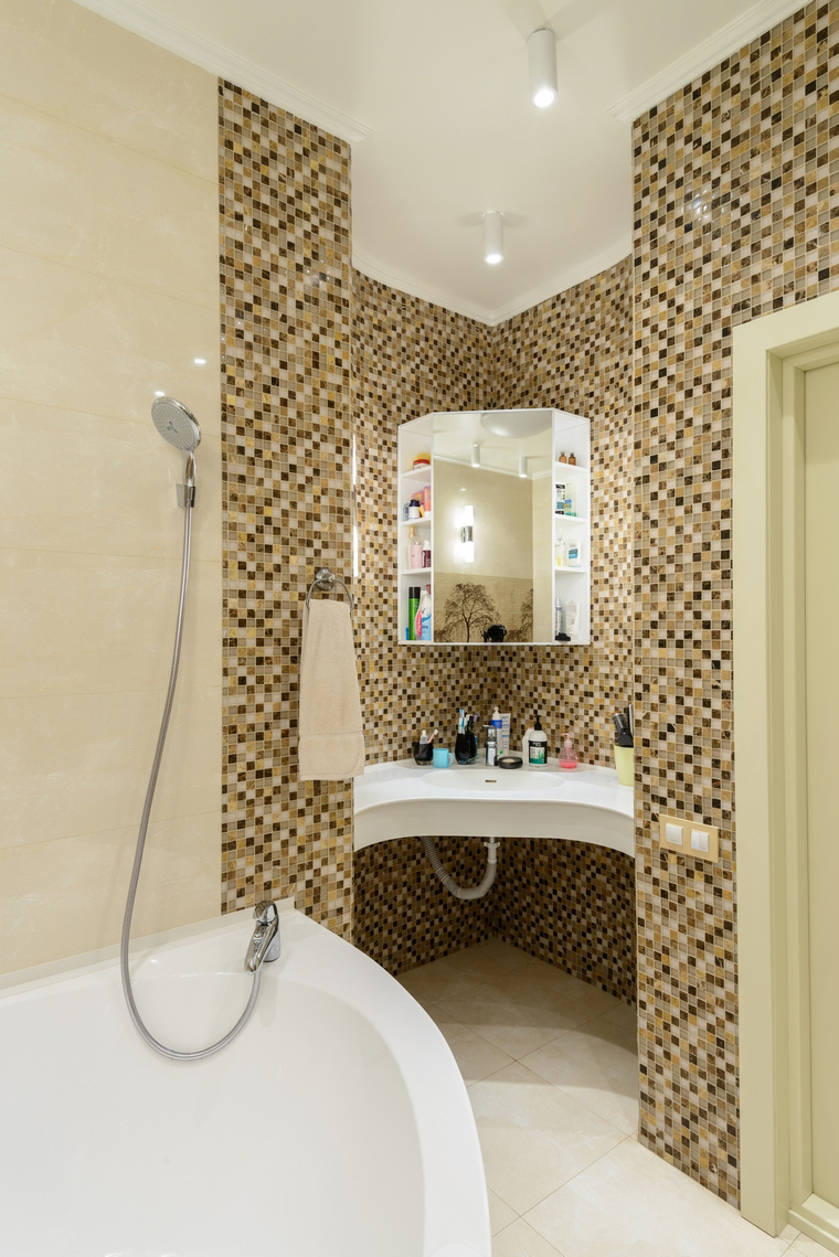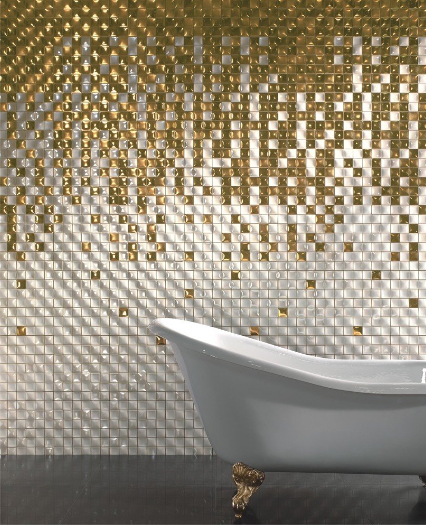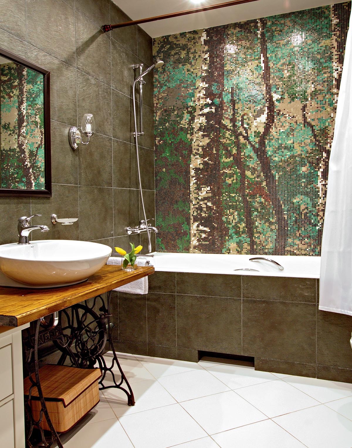 แม้แต่พื้นที่ขนาดเล็กที่ตกแต่งด้วยกระเบื้องโมเสคขนาดเล็กจะโดดเด่นในการออกแบบของห้อง แต่เนื่องจากวัสดุมีราคาสูงจึงไม่สามารถใช้งานได้ทุกคน