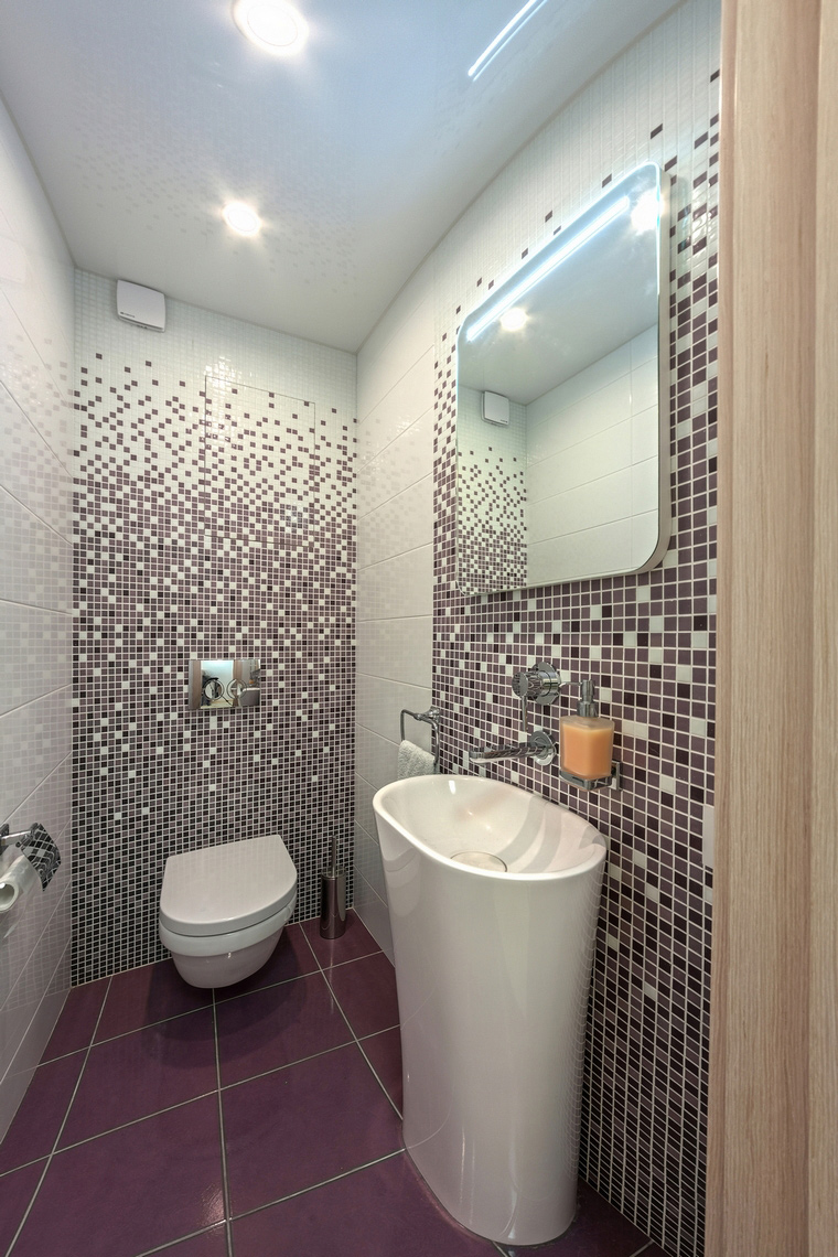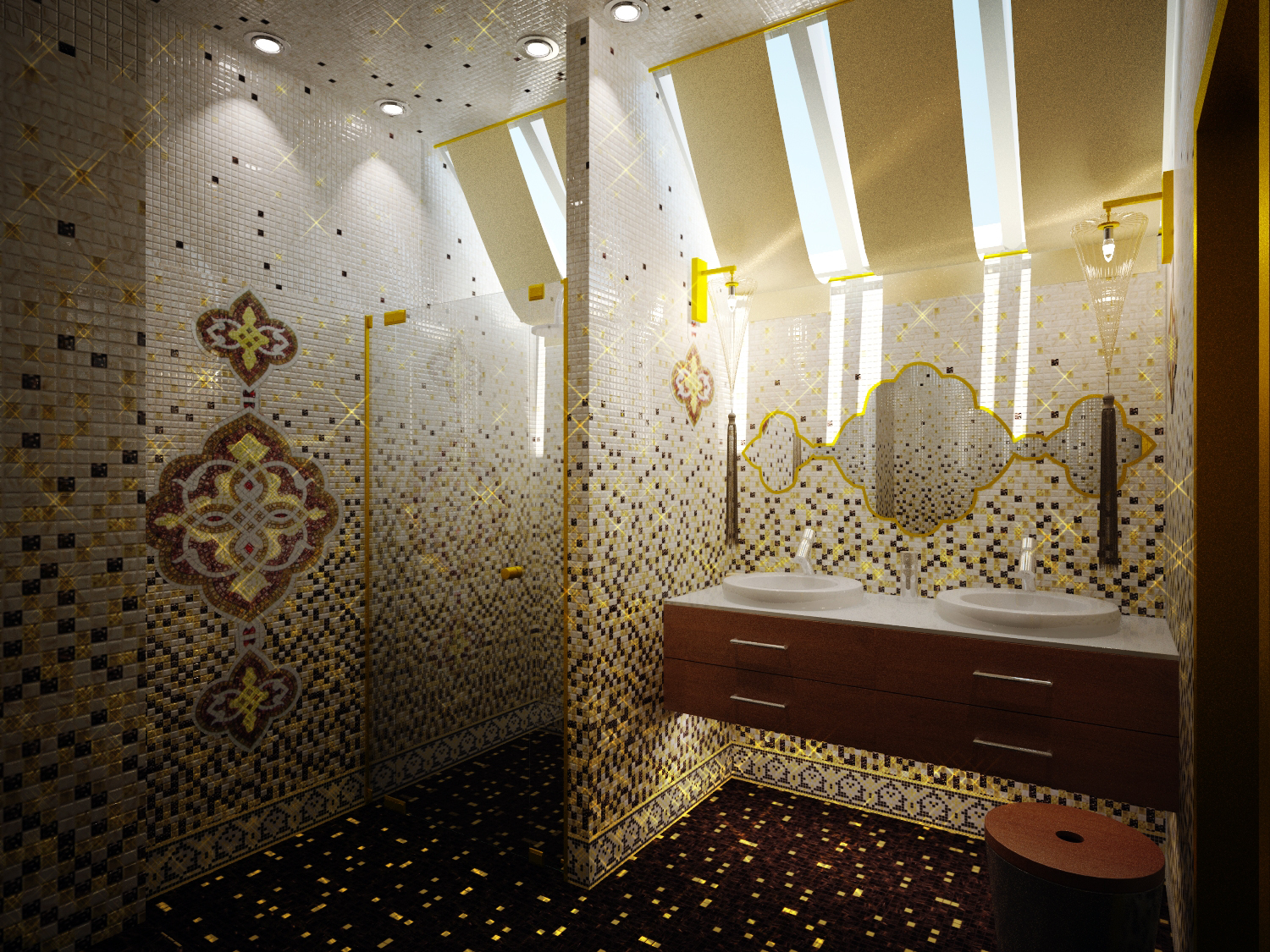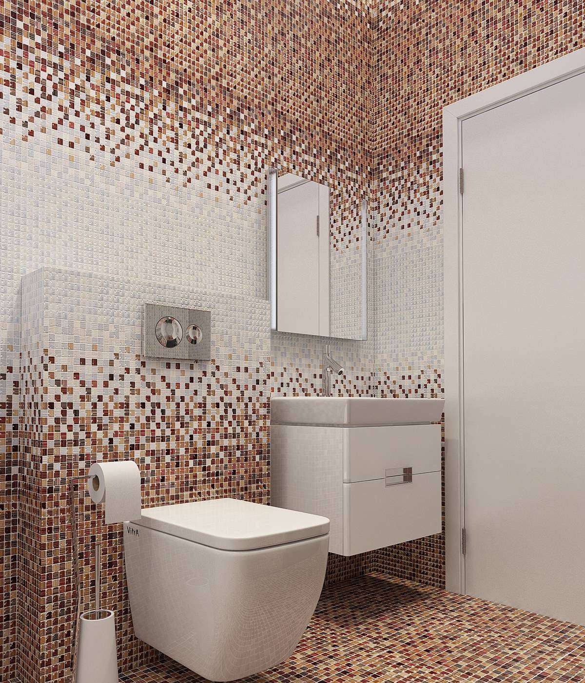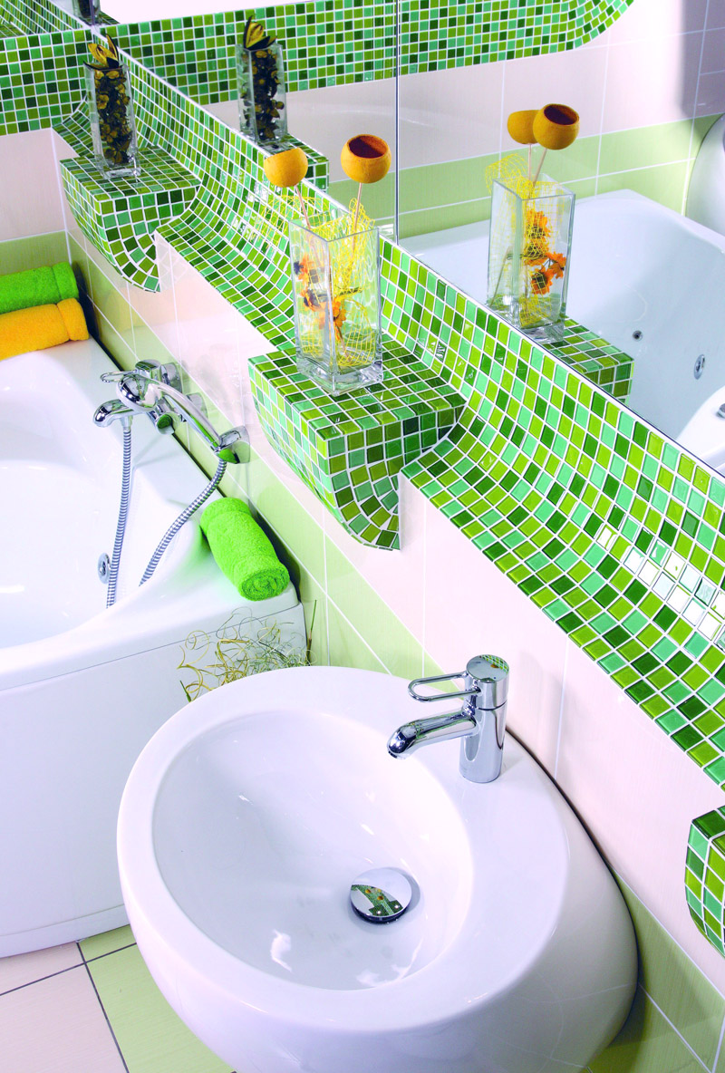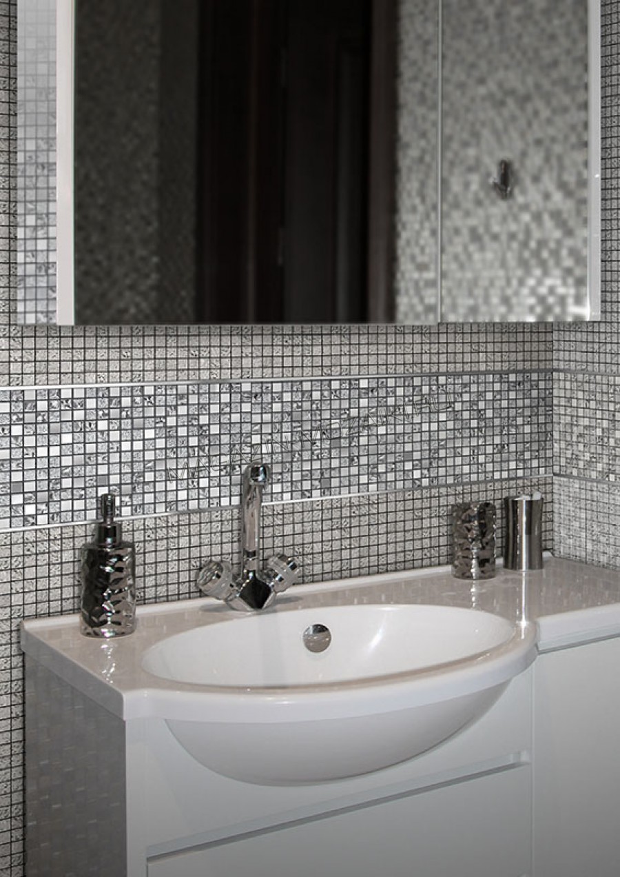 แม้แต่พื้นที่ขนาดเล็กที่ตกแต่งด้วยกระเบื้องโมเสคขนาดเล็กจะโดดเด่นในการออกแบบของห้อง แต่เนื่องจากวัสดุมีราคาสูงจึงไม่สามารถใช้งานได้ทุกคน