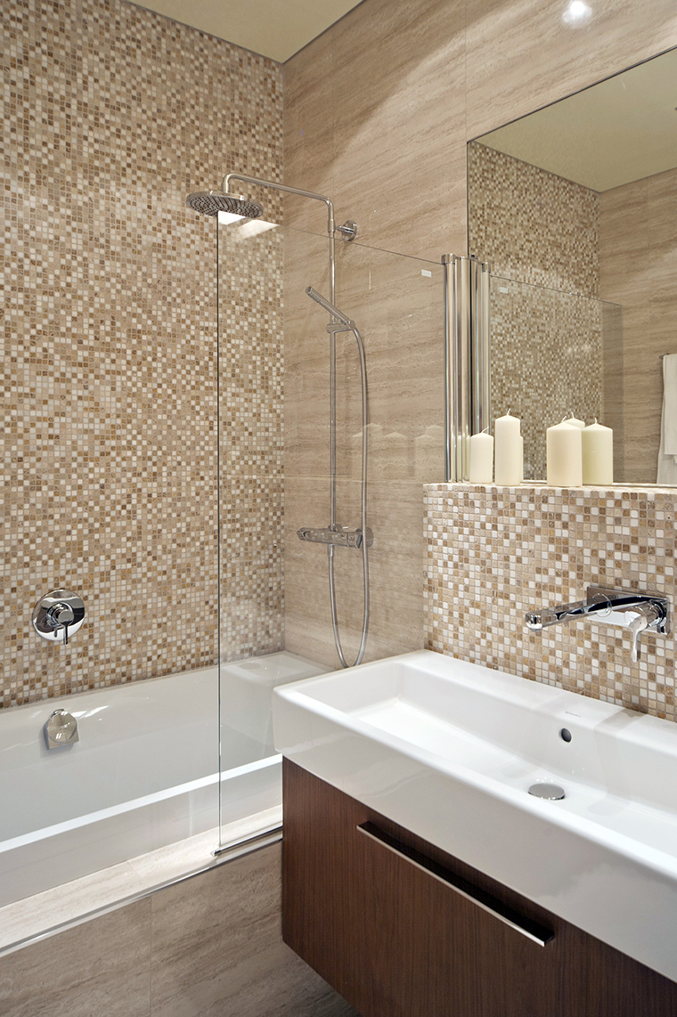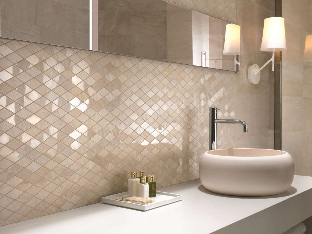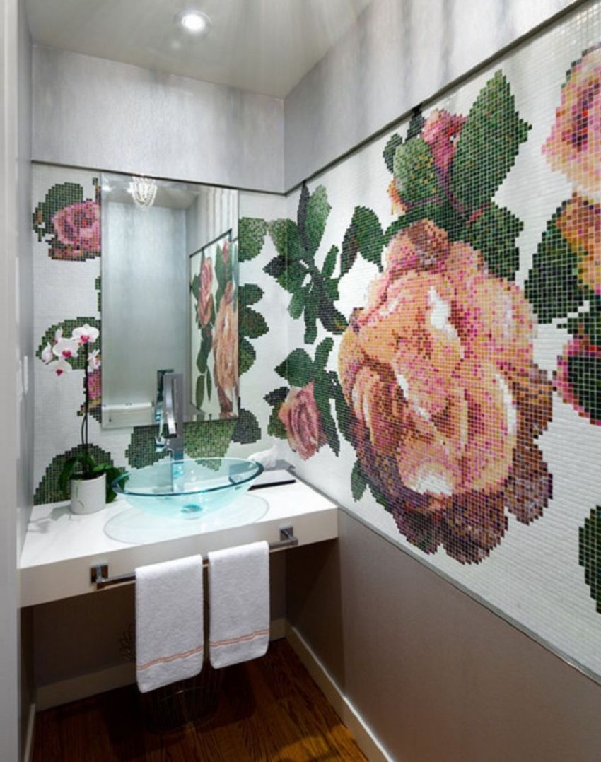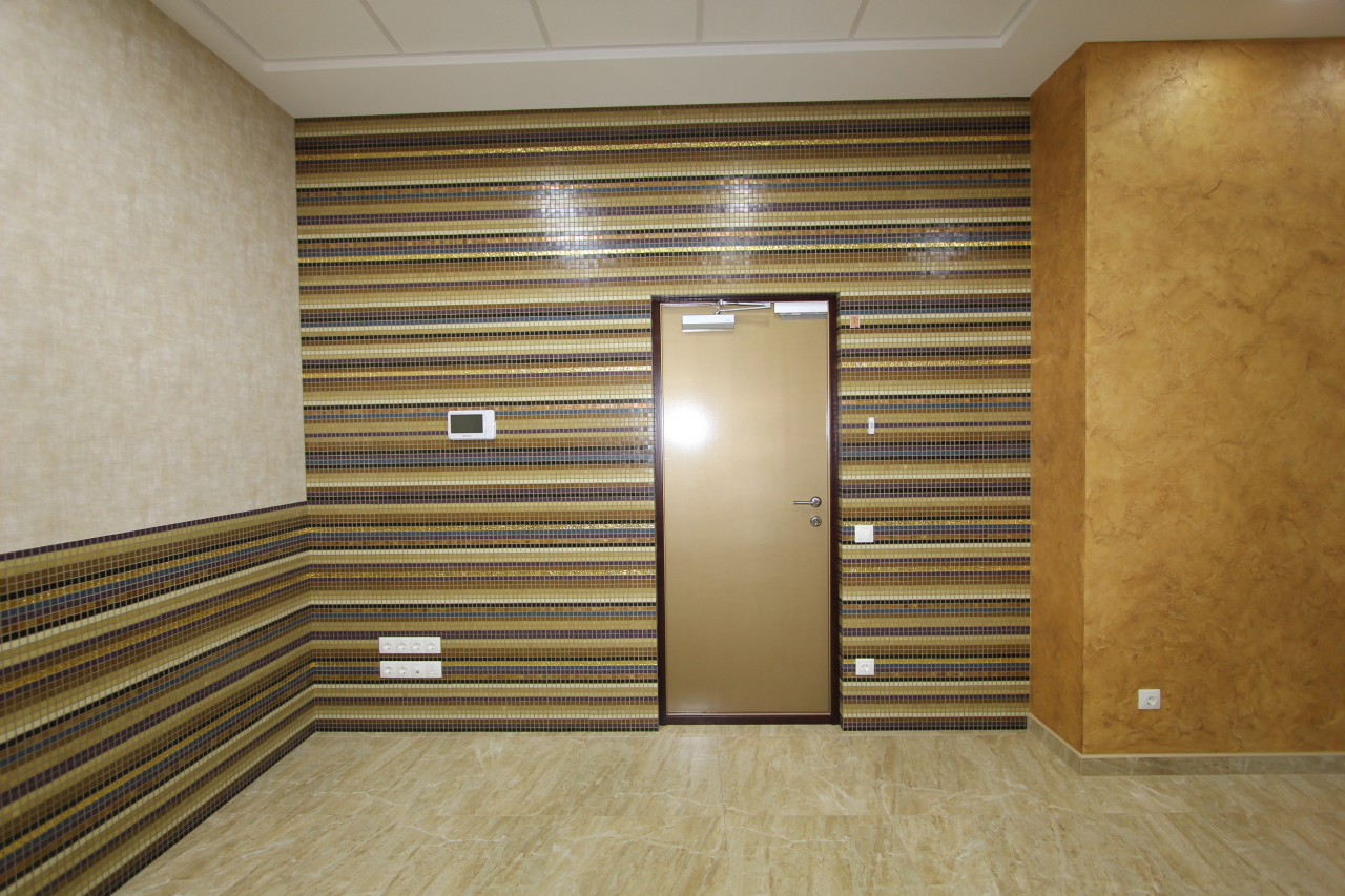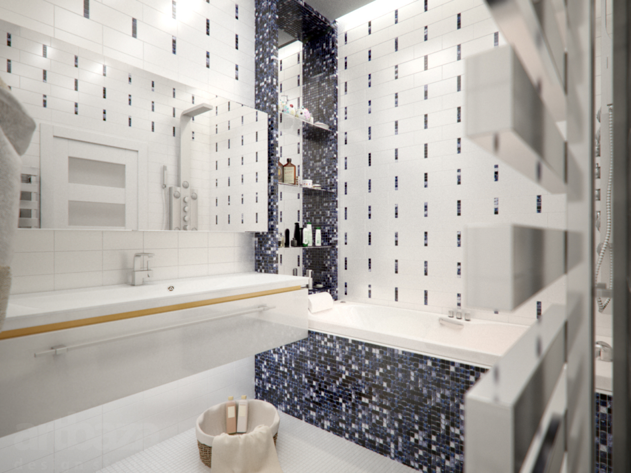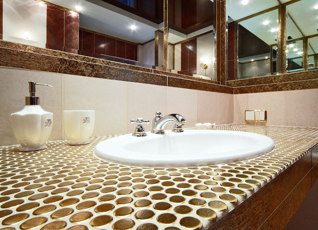 แม้แต่พื้นที่ขนาดเล็กที่ตกแต่งด้วยกระเบื้องโมเสคขนาดเล็กจะโดดเด่นในการออกแบบของห้อง แต่เนื่องจากวัสดุมีราคาสูงจึงไม่สามารถใช้งานได้ทุกคน