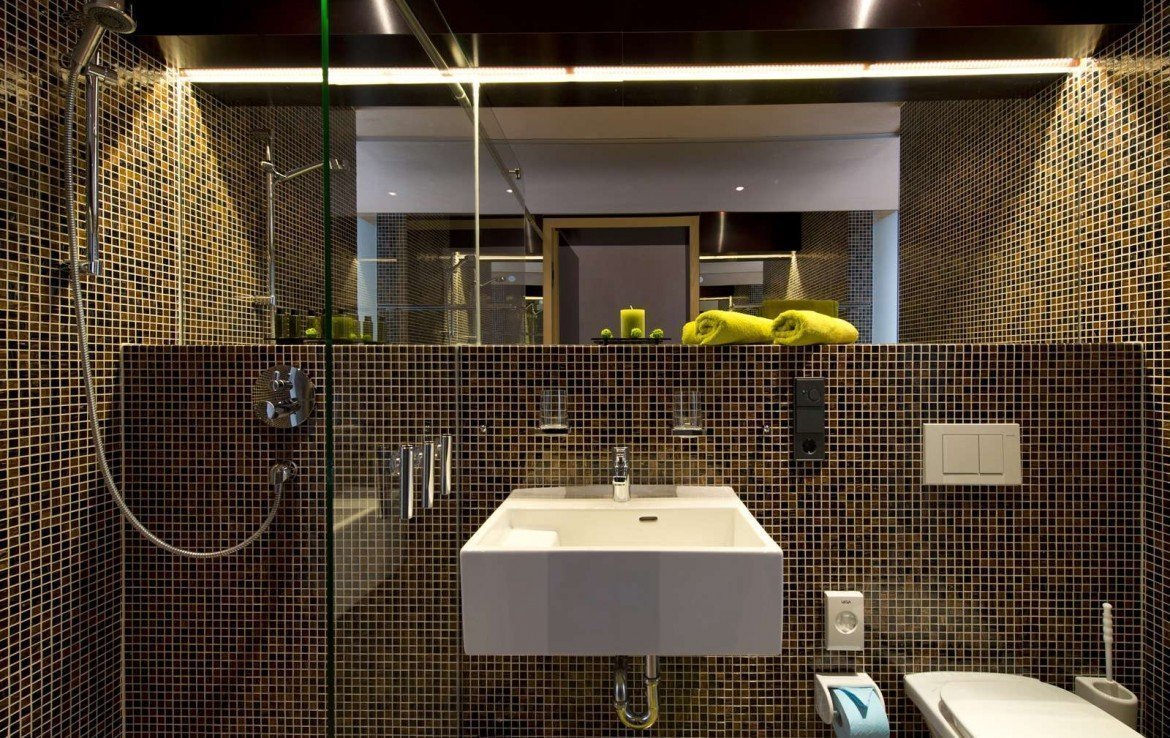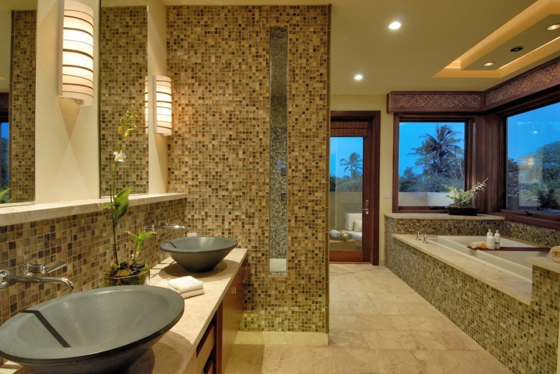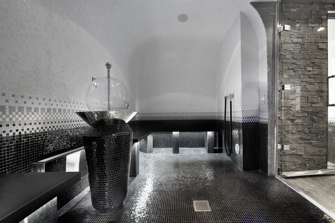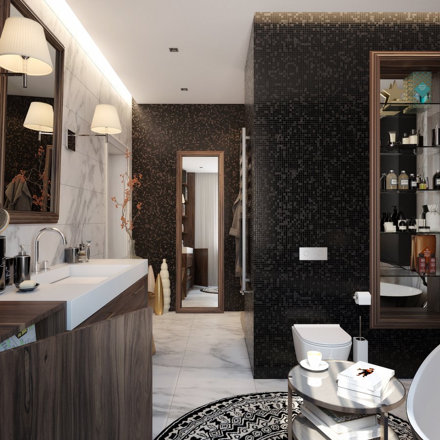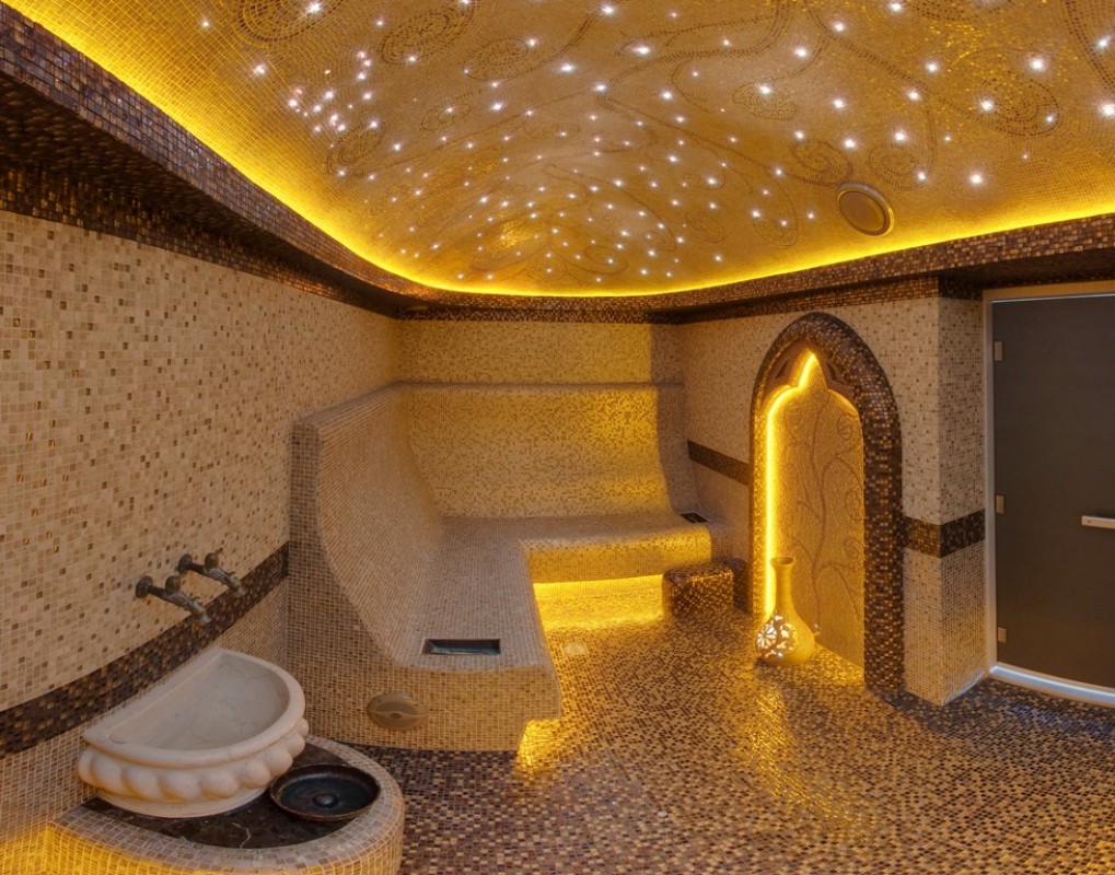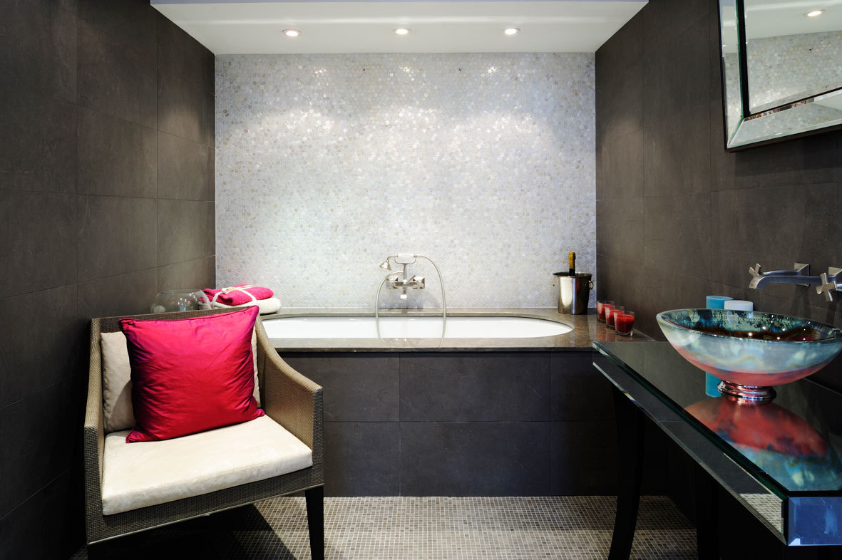 แม้แต่พื้นที่ขนาดเล็กที่ตกแต่งด้วยกระเบื้องโมเสคขนาดเล็กจะโดดเด่นในการออกแบบของห้อง แต่เนื่องจากวัสดุมีราคาสูงจึงไม่สามารถใช้งานได้ทุกคน