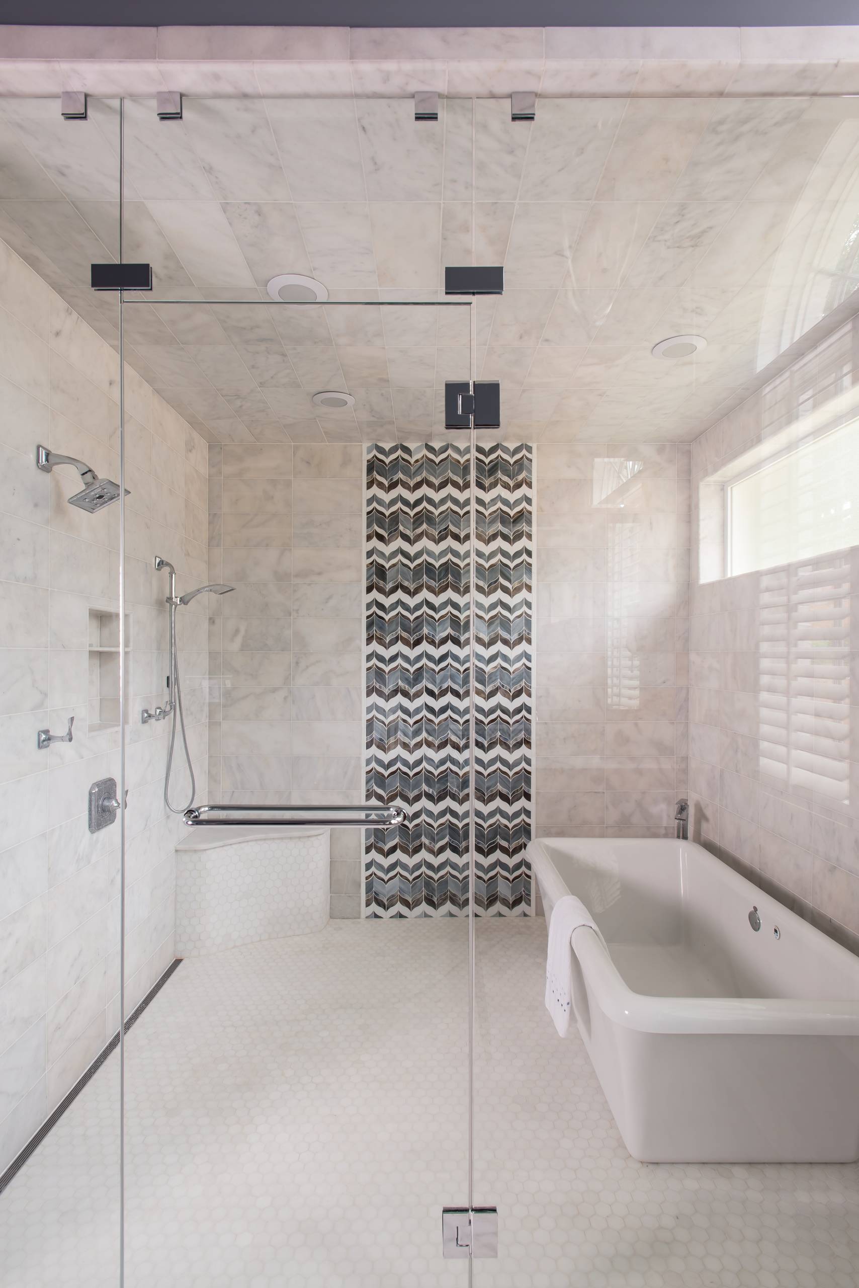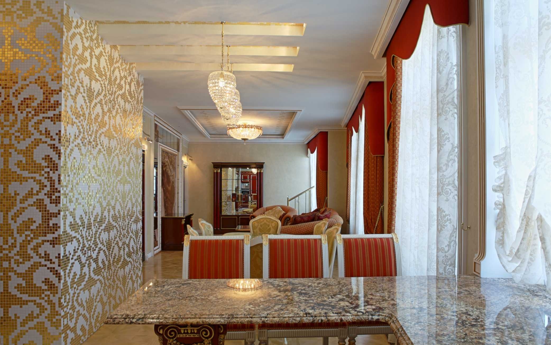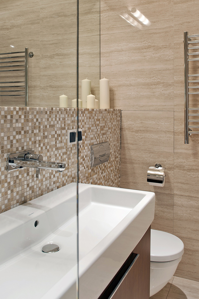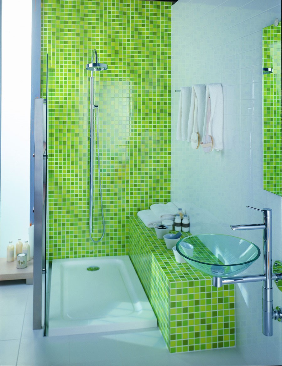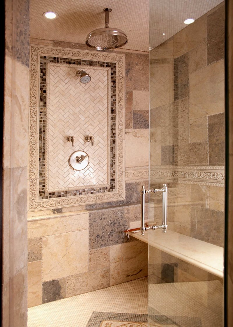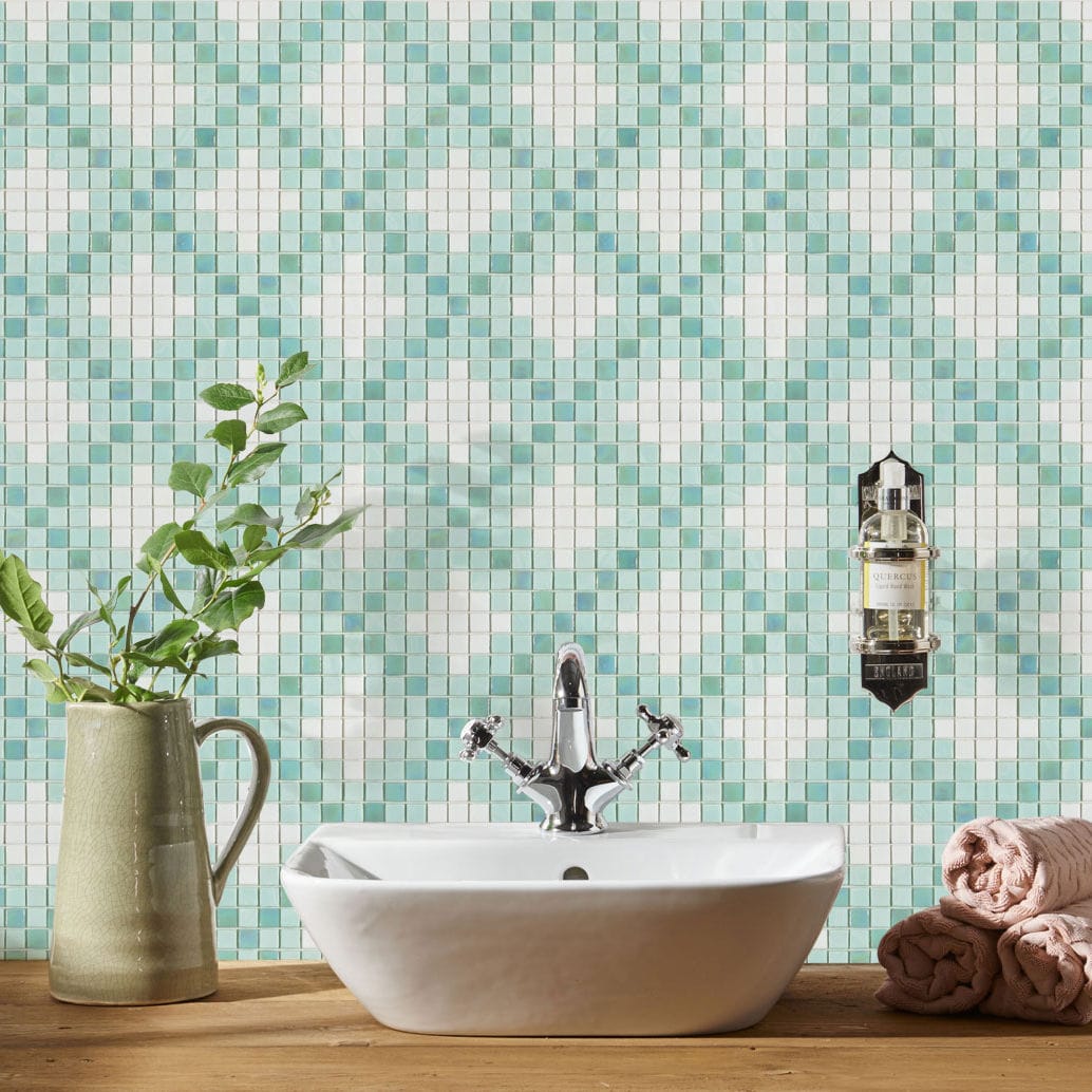 แม้แต่พื้นที่ขนาดเล็กที่ตกแต่งด้วยกระเบื้องโมเสคขนาดเล็กจะโดดเด่นในการออกแบบของห้อง แต่เนื่องจากวัสดุมีราคาสูงจึงไม่สามารถใช้งานได้ทุกคน