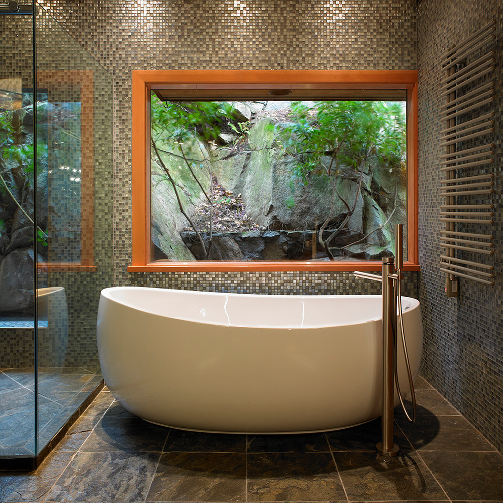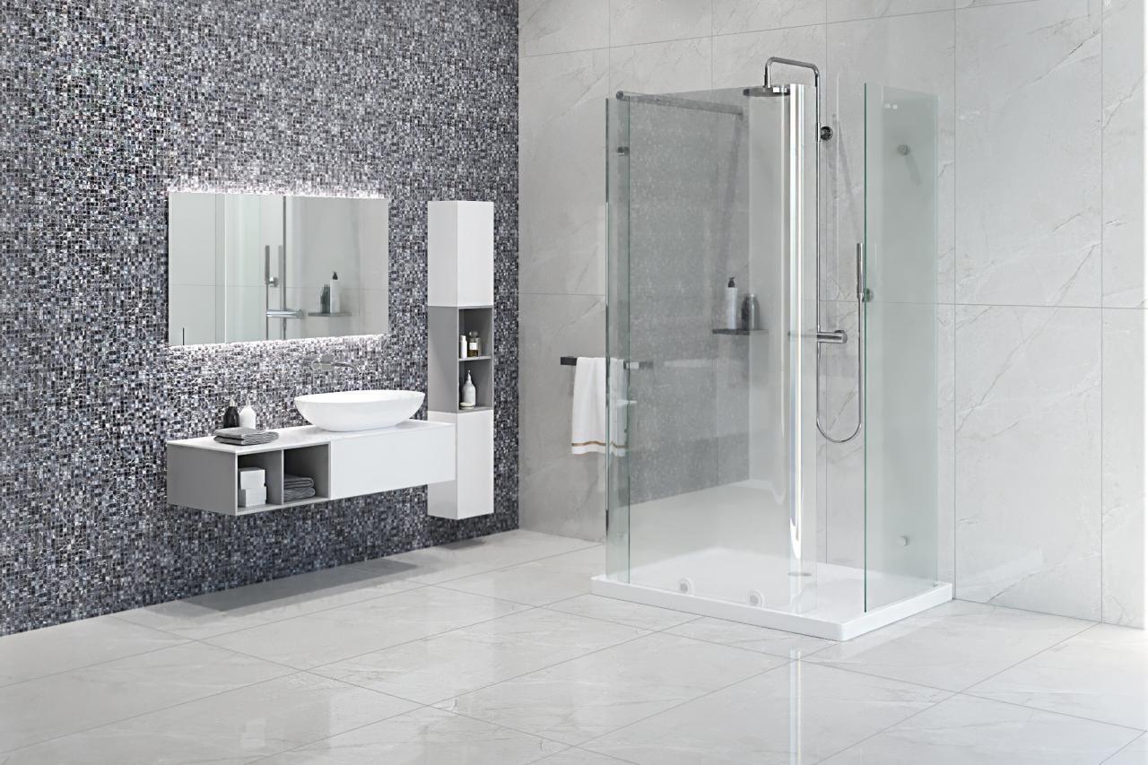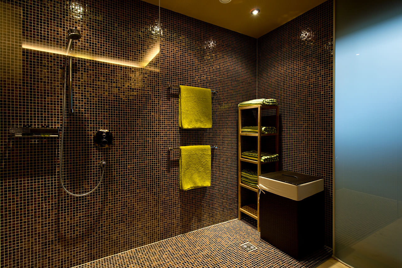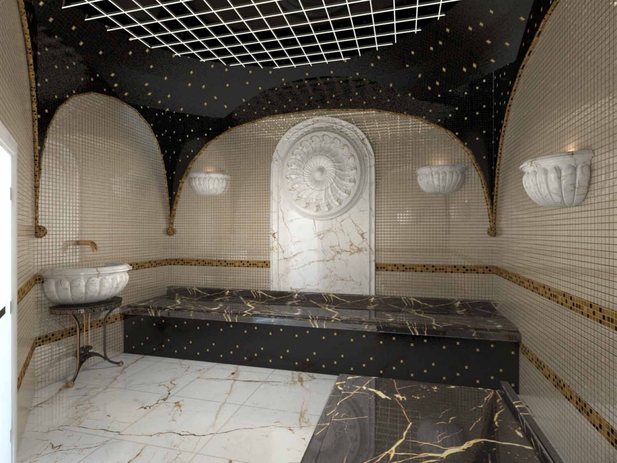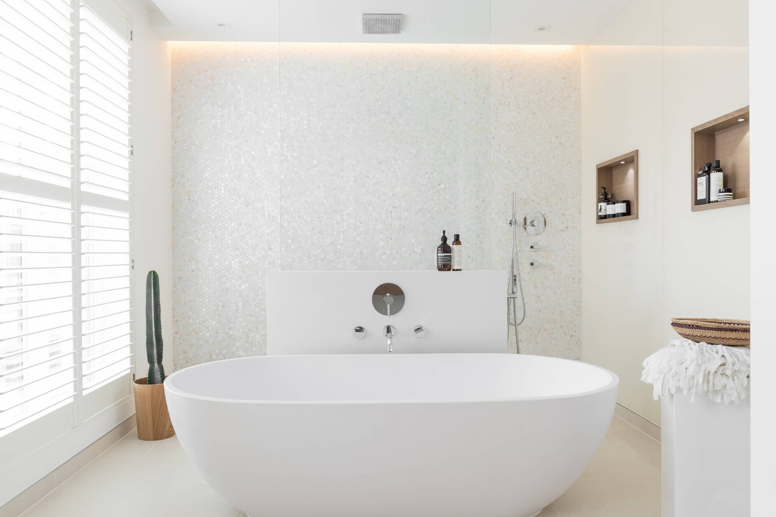 แม้แต่พื้นที่ขนาดเล็กที่ตกแต่งด้วยกระเบื้องโมเสคขนาดเล็กจะโดดเด่นในการออกแบบของห้อง แต่เนื่องจากวัสดุมีราคาสูงจึงไม่สามารถใช้งานได้ทุกคน
