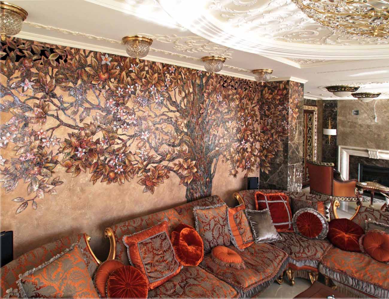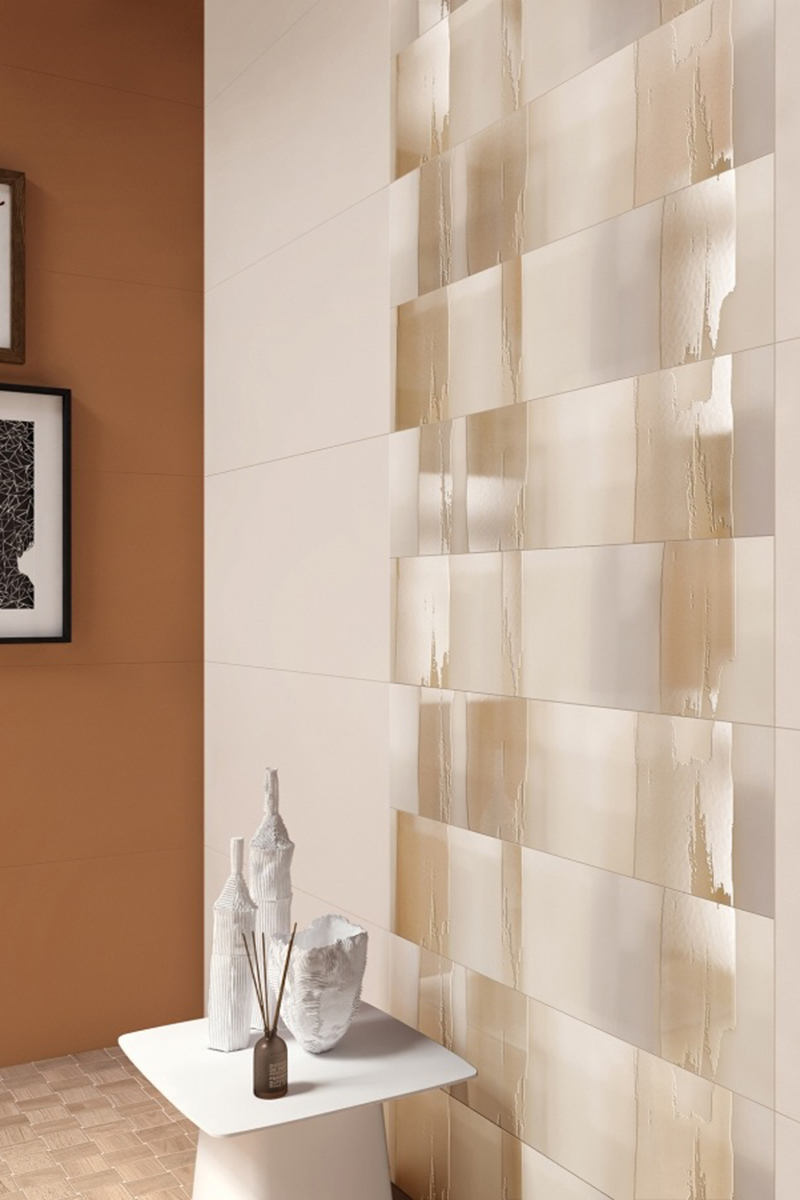 การเล่นสีที่สดใสสามารถทำได้โดยใช้สีและพื้นผิวที่แตกต่างกัน เฉดสีหลักส่วนใหญ่เลือกดินเผา สีน้ำตาล, เหลือง บนพื้นหลังสีเหล่านี้ดูดี:
