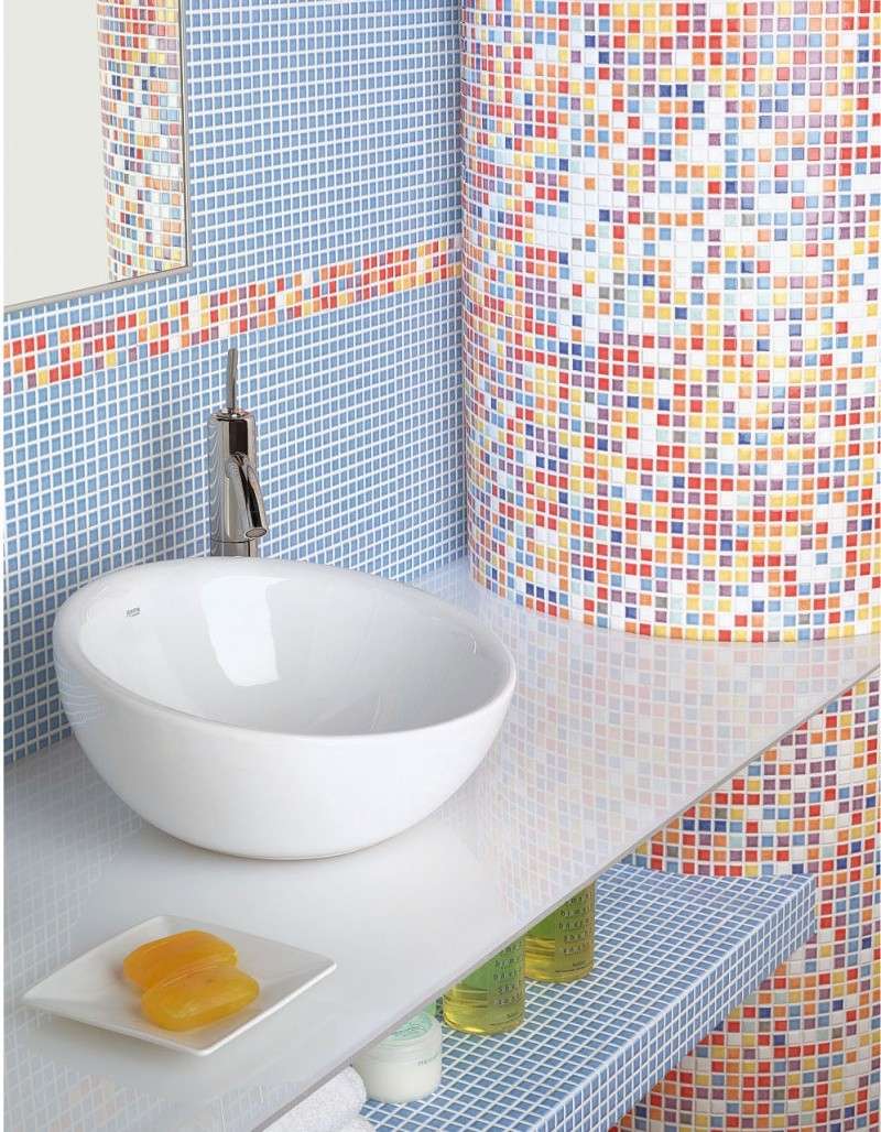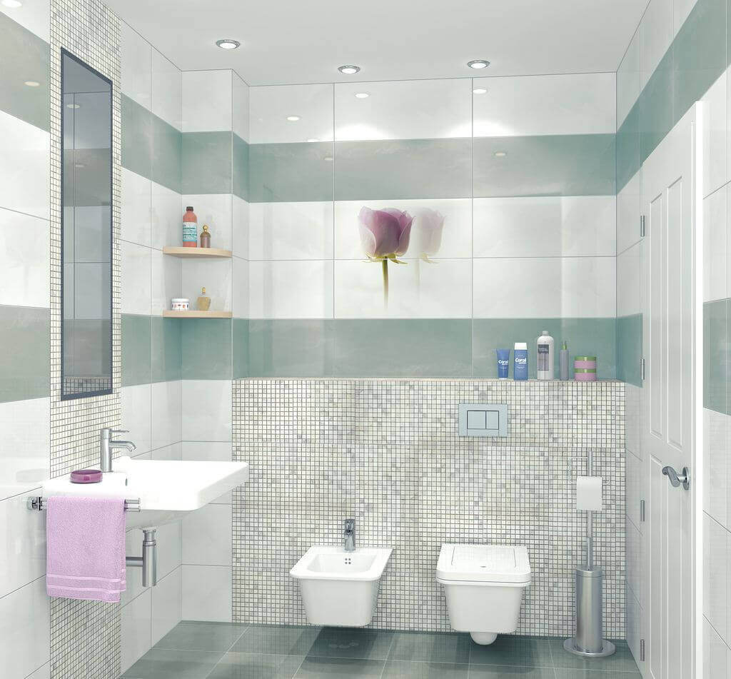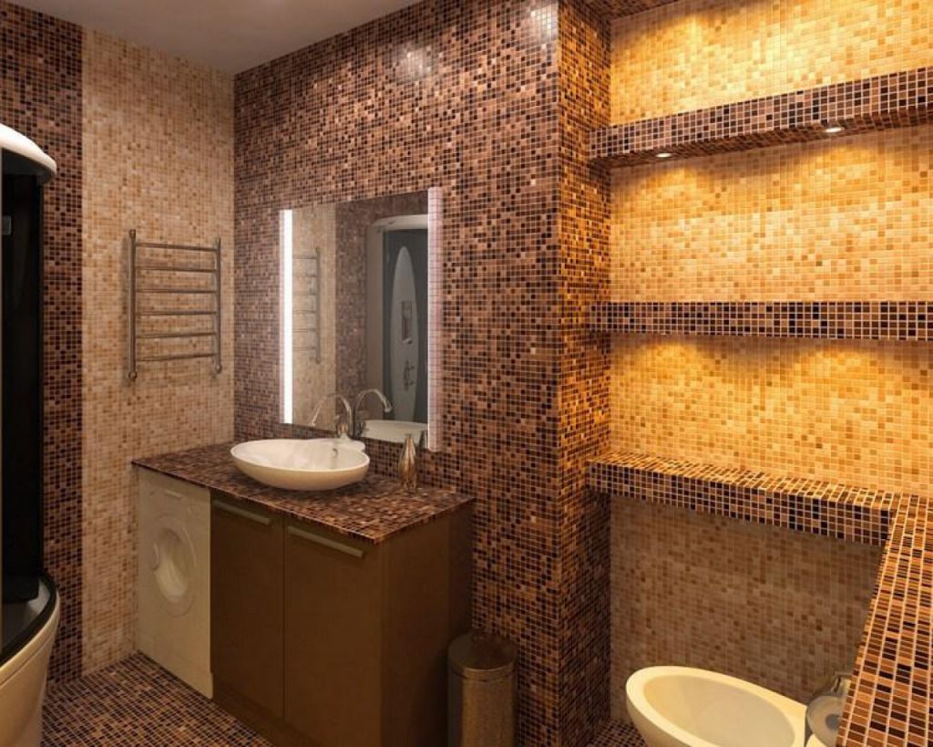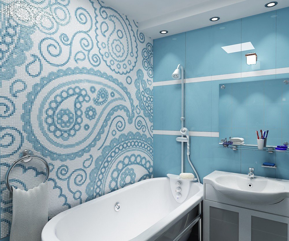 สามารถใช้กระเบื้องโมเสกร่วมกับกระเบื้อง ด้วยความช่วยเหลือของมันคุณสามารถจัดวางแผง ทำผนังในสีเดียวหรือทำให้การเปลี่ยนระหว่างเฉดสีราบรื่น