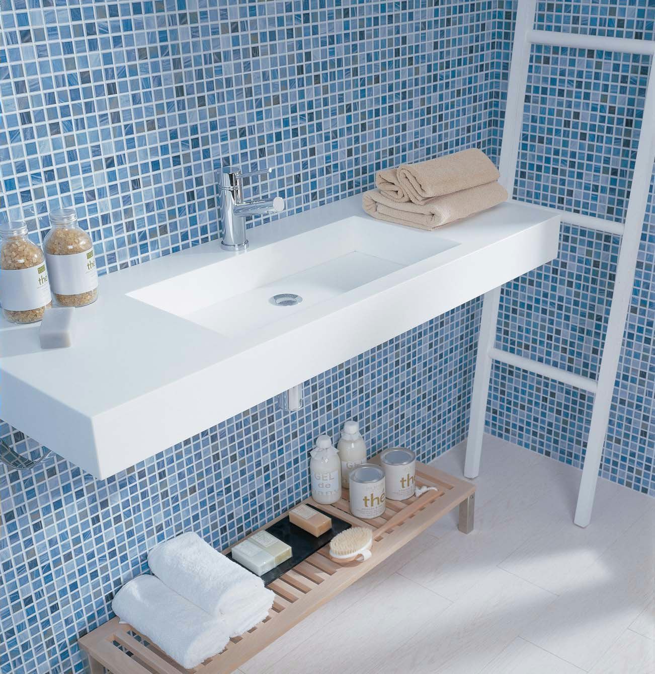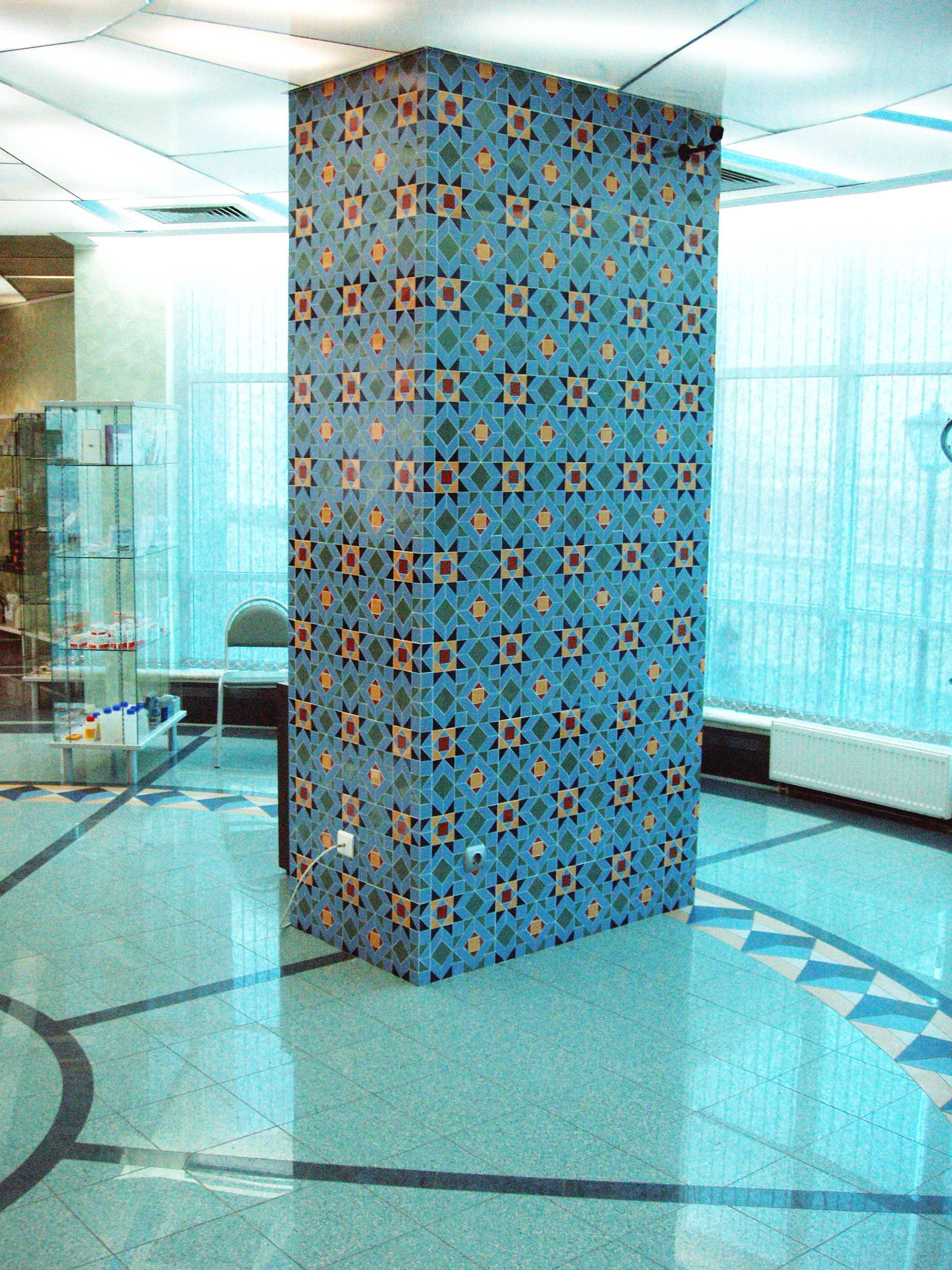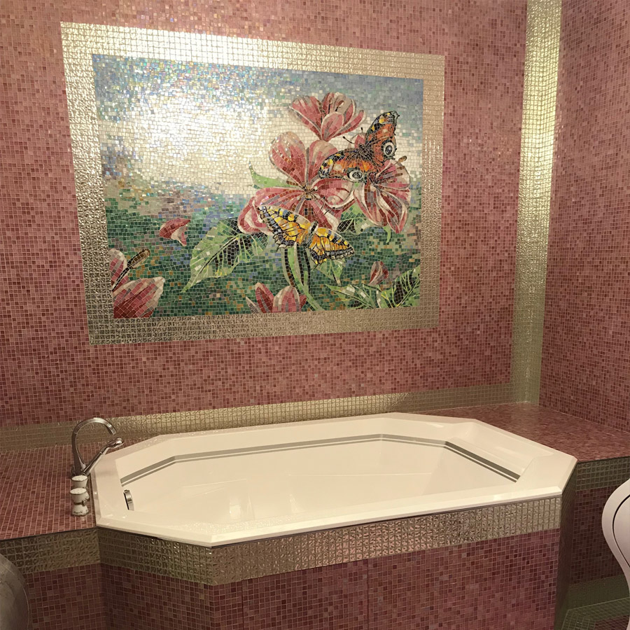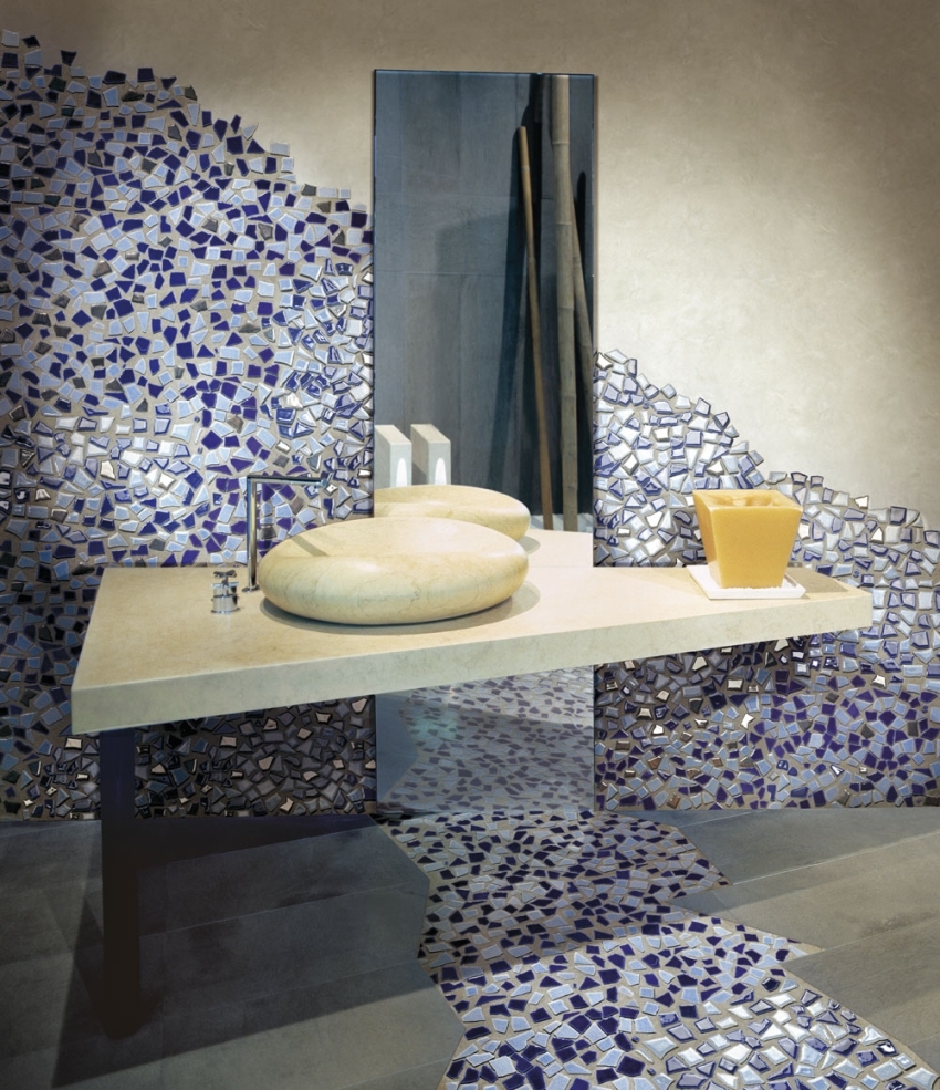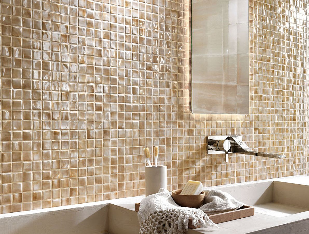 วัสดุนี้มีคุณสมบัติที่ดีสำหรับความชื้นความทนทาน มันสะดวกที่สุดสำหรับพวกเขาที่จะวีเนียร์ผิวที่ไม่เรียบและโค้ง โมเสคสามารถวางพร้อมกับกระเบื้องเซรามิก, เปลี่ยนความกว้างและความยาวในสถานที่ของการตกแต่งในขณะที่ไม่ตัดกระเบื้อง