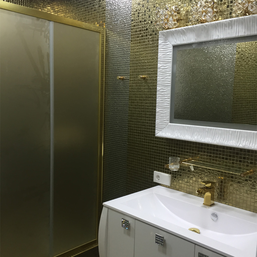 ถือว่าเป็นหนึ่งในค่าใช้จ่ายที่แพงที่สุดเพราะ พื้นฐานของมันคือกระจกธรรมชาติ ด้วยแสงที่ดีกระเบื้องดังกล่าวดูเหมือนว่าจะเรืองแสงมันมีสีสดใสและอิ่มตัวในตัวเองวัสดุนี้จะดูดีในการตกแต่งภายในใด ๆ