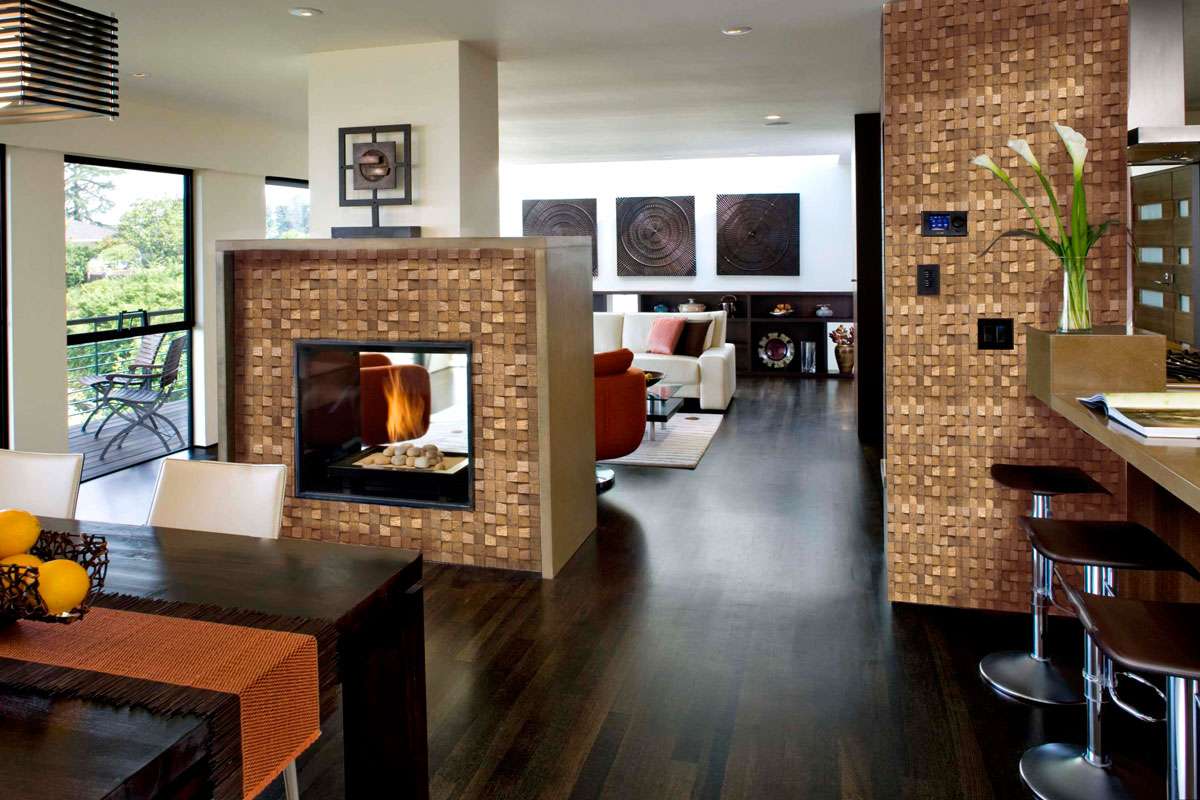 หากบ้านมีเตาผิงสามารถใช้กระเบื้องโมเสคเพื่อเน้นและออกแบบบริเวณนี้ คุณสามารถเลือกกระเบื้องโมเสคที่มีสีเดียวกันกับส่วนที่เหลือของห้องหรือทำรูปแบบในพื้นที่นี้เป็นจ้ำ ๆ หลายสี