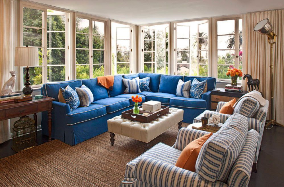- เพื่อเอฟเฟกต์ที่สว่างและตัดกัน สีน้ำเงิน ผ้าคลุมเตียงผ้าม่านผสมการตกแต่งอย่างดี