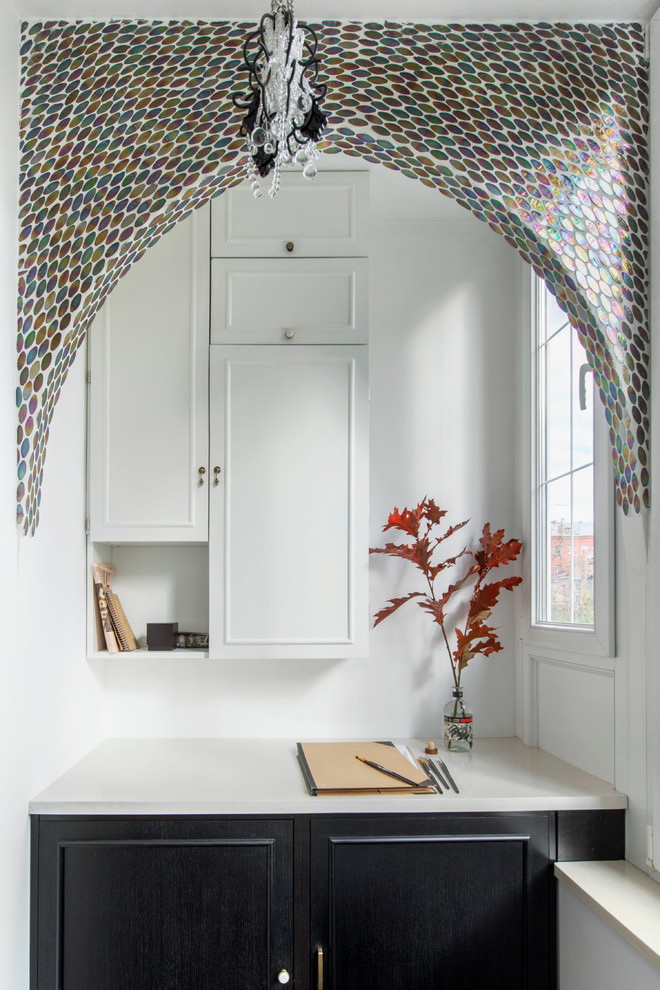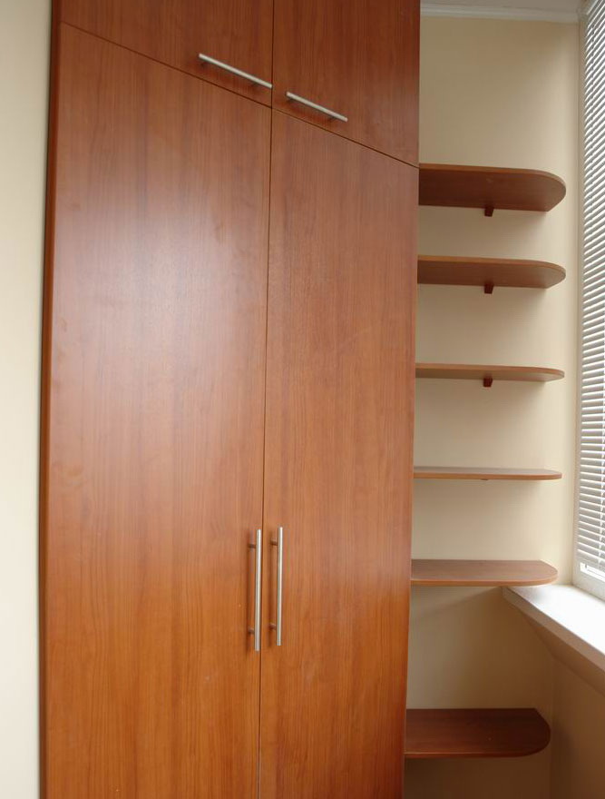 มีคุณสมบัติอีกอย่างหนึ่งของตู้แบบบิวท์อินที่ผลิตตามขนาดที่ลูกค้าต้องการ - คุณสามารถสร้างรูปร่างที่ผิดปกติได้ บางครั้งการตัดสินใจติดตั้งบนระเบียงนั้นเกิดขึ้นหลังจากการยกเครื่องเสร็จ - มีการทำธรณีประตูหน้าต่างขนาดใหญ่ที่สวยงามซึ่งยื่นออกมาหลายเซนติเมตรจากผนังหลัก