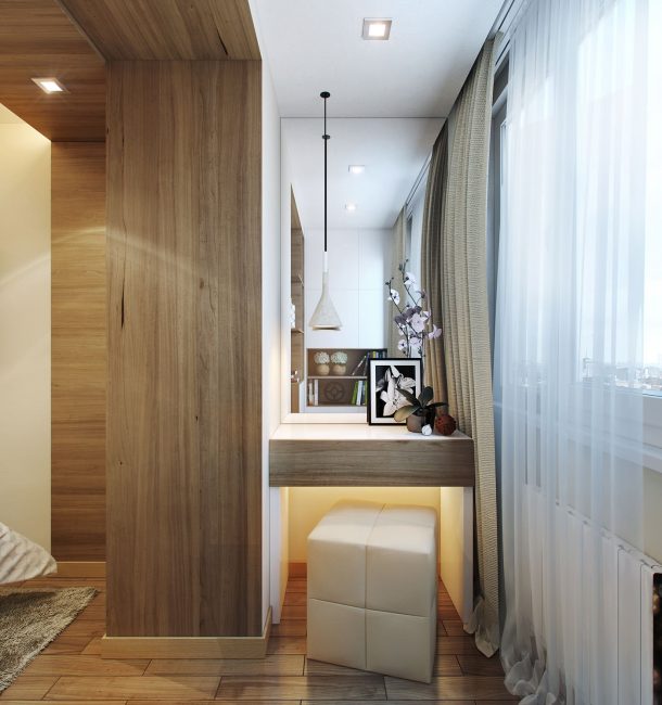 - ตู้เสื้อผ้าที่ใหญ่และกว้างขวางที่สุดจะได้รับหากมีช่องลึกบนระเบียง คุณสามารถติดตั้งการออกแบบด้านหน้าปกติหรือมุมขนาดใหญ่